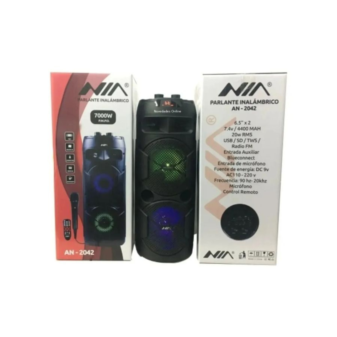 ¿Estás cansado de altavoces que distorsionan cuando subes el volumen o que se quedan sin batería a mitad de la reunión? La NIA AN-2042 no es solo un parlante; es una estación de entretenimiento completa. Equipada con Doble Parlante de 6.5” y la última tecnología Bluetooth 5.0, te garantiza una conexión estable y un sonido envolvente que llena la habitación. Además, su sistema de iluminación LED crea la atmósfera visual perfecta para acompañar tus mejores playlists.